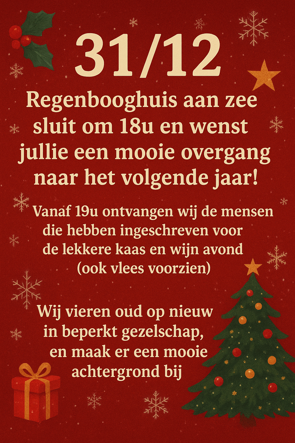 | 31/12 *** | Regenbooghuis aan zee sluit om 18u en wenst jullie een mooie overgang naar het volgende jaar! |