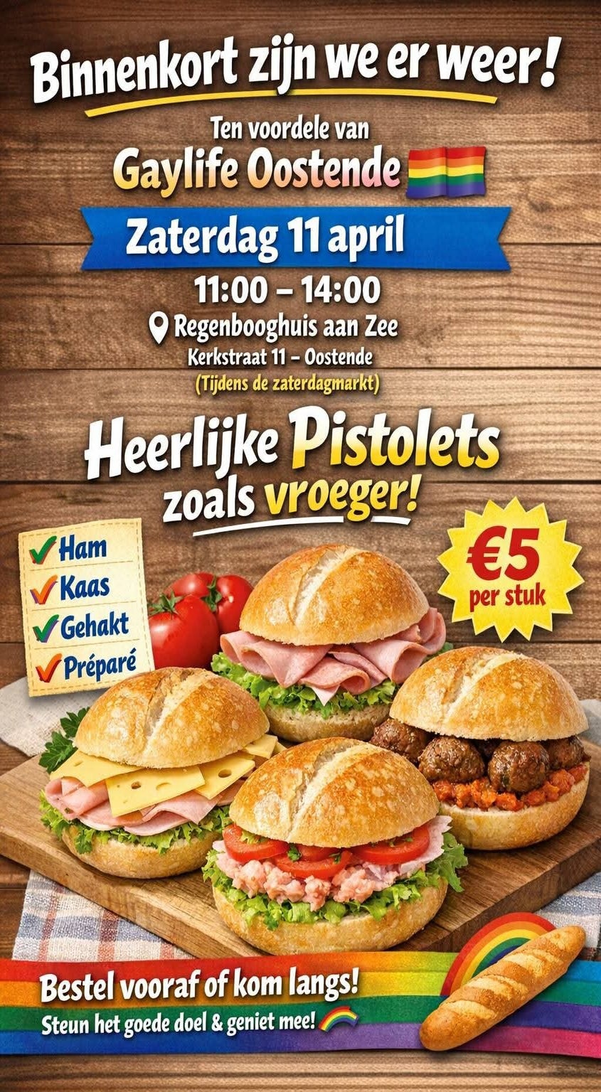 | 11/04** | Pistolets ten voordele van Gaylife Oostende | 11u-14u | RAZ |